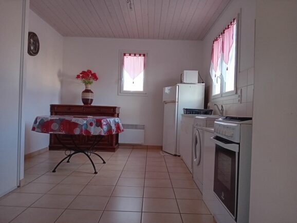 • Cuisine avec frigo-congélateur, gazinière(feux gaz et four électrique), micro-ondes, cafetière, batterie de vaisselle